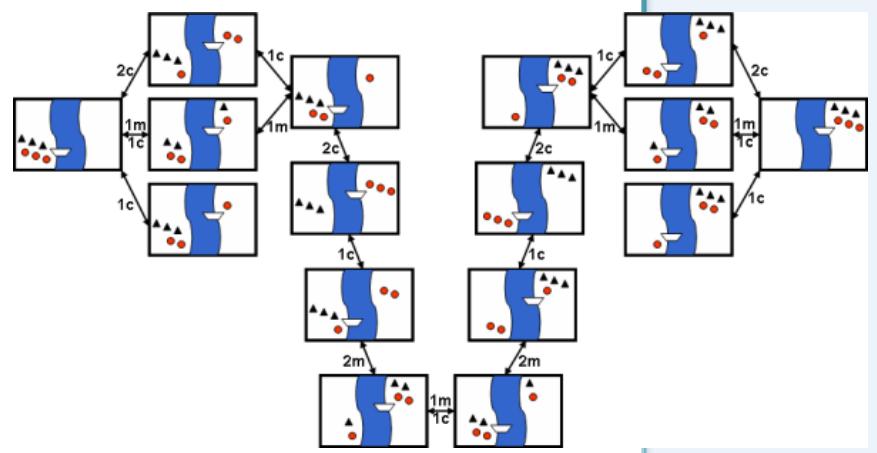 ◼ 并且要求无论何时何地 (在河的任意岸或在小船上):传教士的人数 ≥ 野蛮人的人数或 传教士的人数