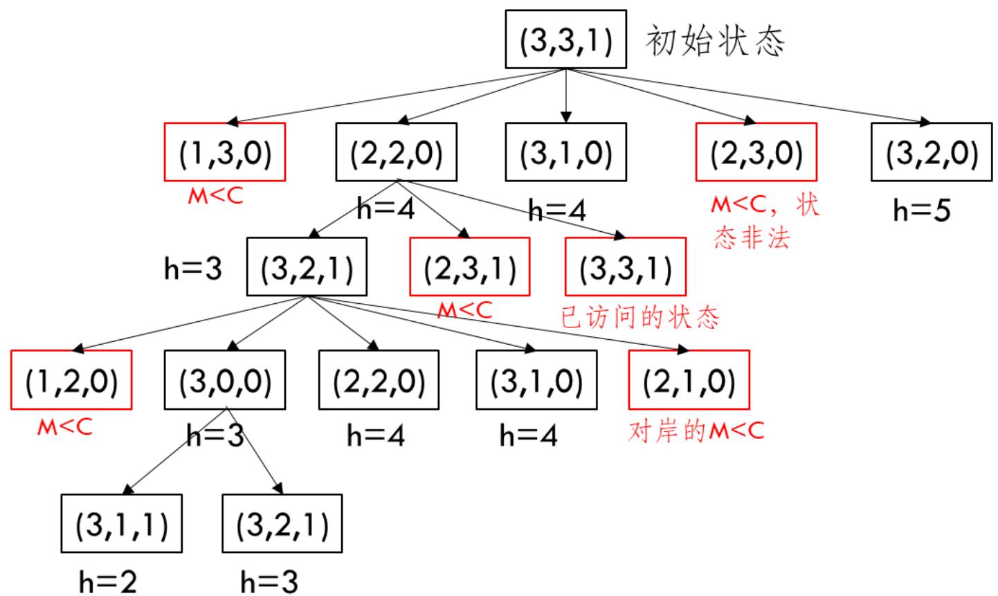 ◼ 状态 (M, C, B) 表示:M – 左岸的传教士的人数,C –左岸的野蛮人的人数, 表示小船在河的左岸