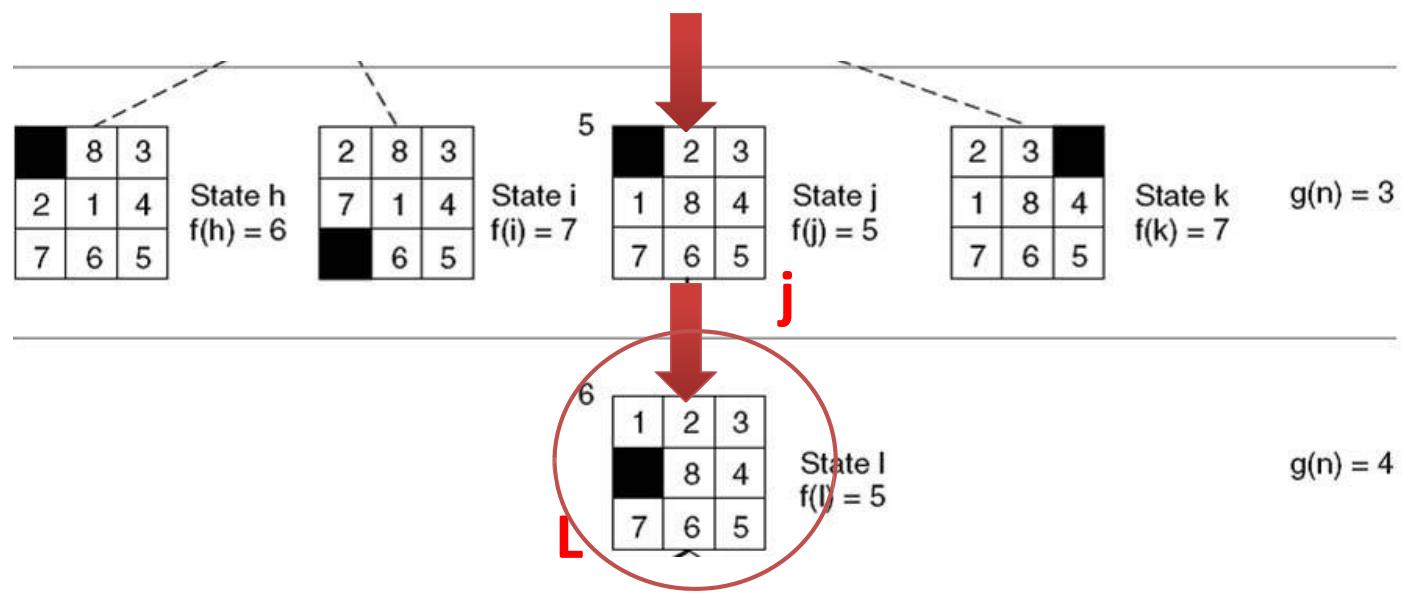 搜索过程:设起点为(1, 2),湖面覆盖区(3,2)和(3, 3),露营地(5,3)。(花括号第一项为坐标,第二项为f=g+h)