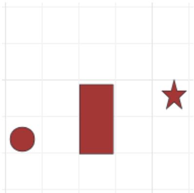 练习2 某探险队需绕过湖到达露营地,地图由方格组成(如右图所示),湖面为不可穿越的障碍区。探险队可向上下左右或对角线移动(水平和垂直移动成本为10,对角线为15)。使用A*算法测绘最终到达目的地的最近行走距离。(探险队、湖面、露营地分别为图中圆形、矩形、星形)