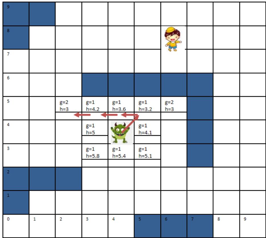 – 两点之间直线最短, 因此可以 设计启发函数为:怪物当前坐 标与小孩目标坐标的直线距离。