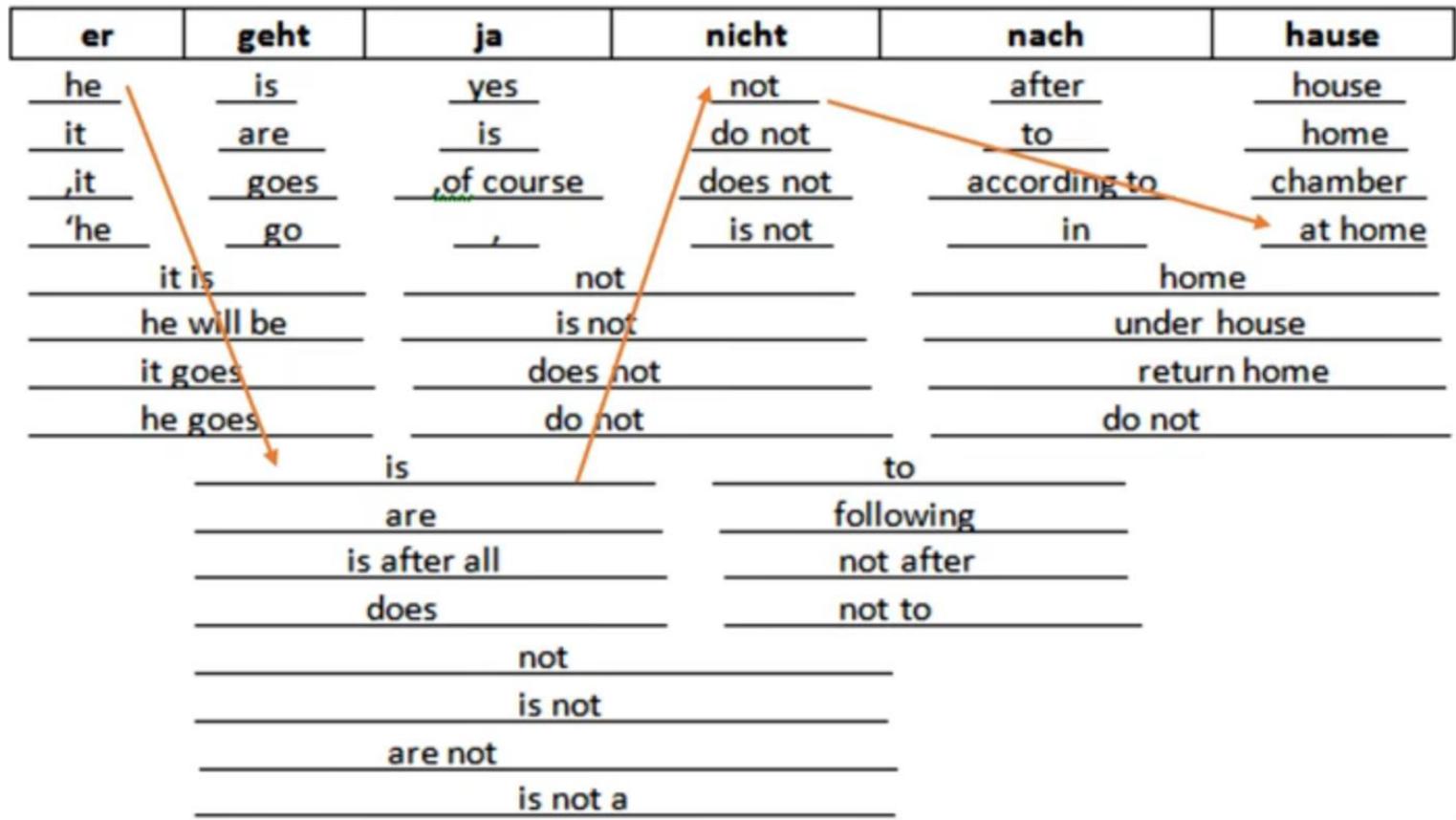 源语言的若干可能的翻译形式需要通过拼接,形成最终的翻译译文。每一个外文词都有很多种翻译方法,所有翻译词形成一个状态空间,最佳译文就是在状态空间中找到一个最佳的搜索路线。