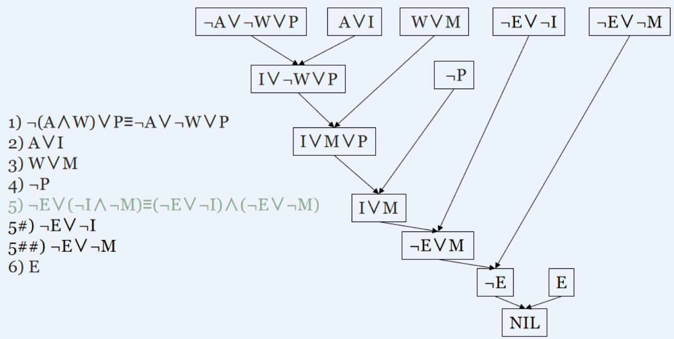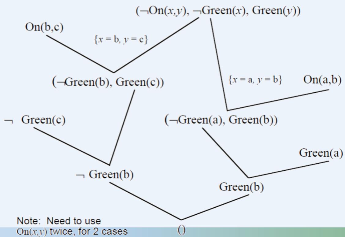 • 限制:参加归结的两个子句中必须至少有一个是单文字子句。