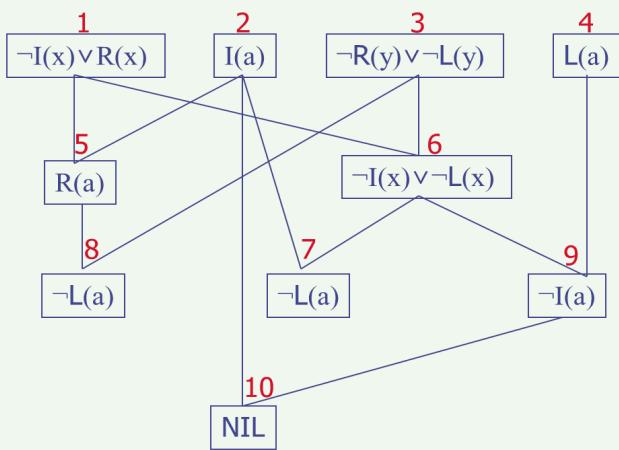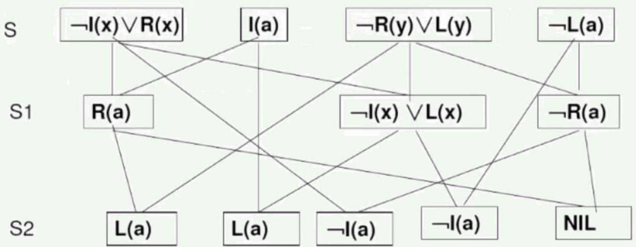 设有子句集 ,其中¬I(x)∨R(x)是目标公式否定后得到的字句。