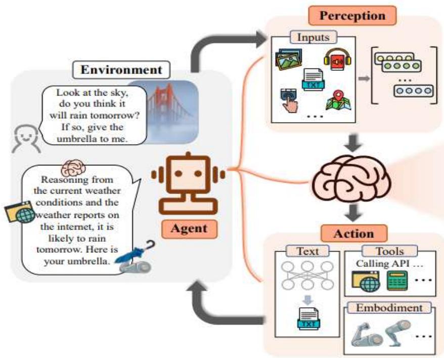 大模型因其强大的通用推理能力而引起了广泛关注。研究人员马上开始利用这些大模型来构造 Agent的大脑(即核心控制器)。基于大模型的 Agent通过将大模型作为主要组件来扩展感知和行动空间,并通过策略如多模态感知和工具使用来制订具体的行动计划。