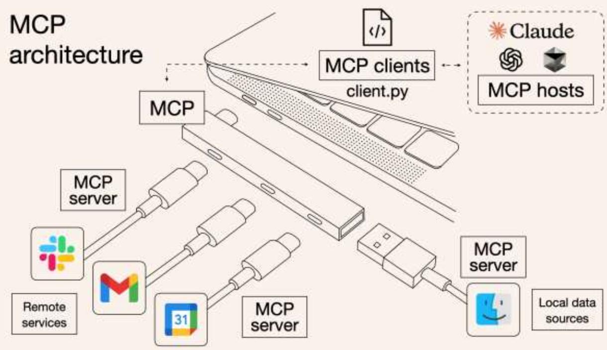 定位:由Anthropic提出的开放标准协议(2024年11月发布),旨在标准化AI大模型与外部数据源、工具之间的交互方式。