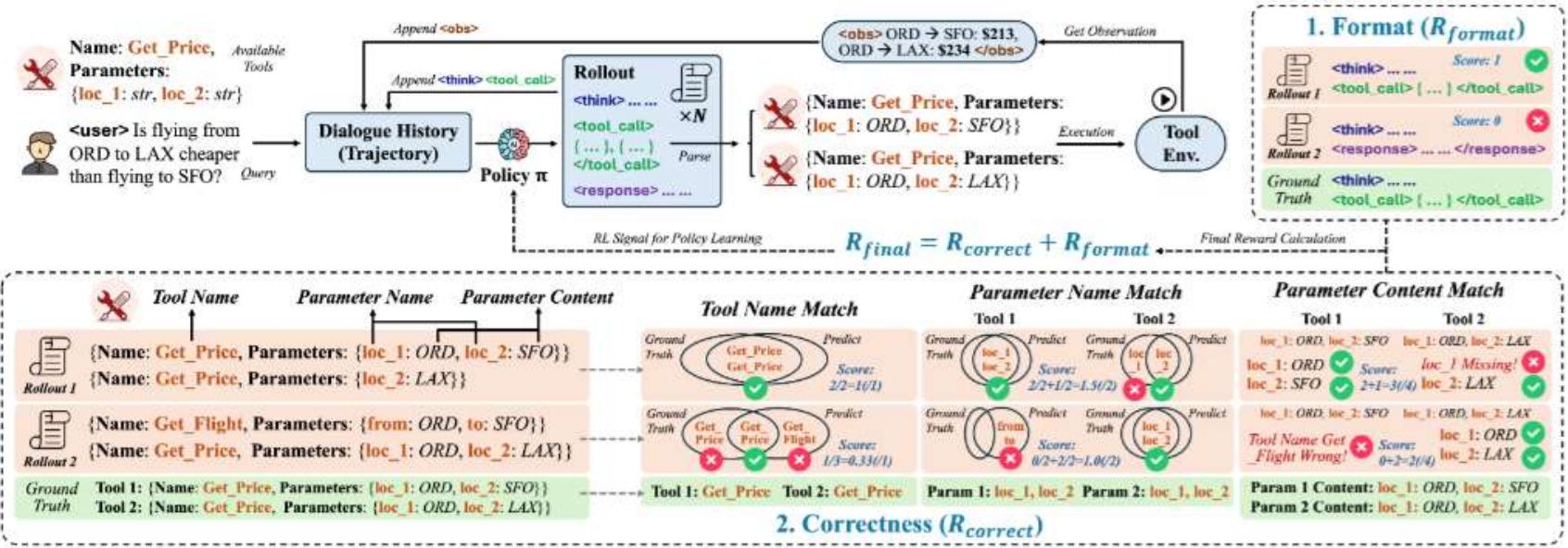 Figure3: Illustration of TIR rollout and calculation of format and correctness reward.