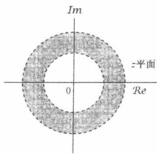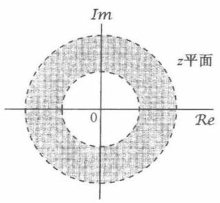 因此,收敛域仅决定于 ,而与 无关。结果,若某一具体的 值在收敛域内,那么位于同一圆上的全部 值(即具有相同的模)也一定在收敛域内。这本身就保证了收敛域是由同心圆环组成的。在讨论性质6时将会看到,事实上收敛域必须仅由一个单一的圆环组成。在某些情况下,收敛域的内圆边界可