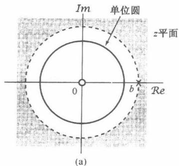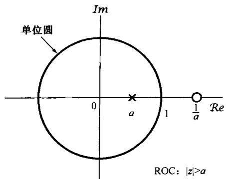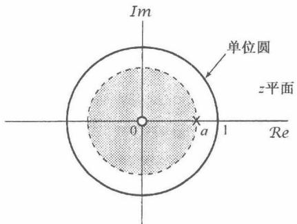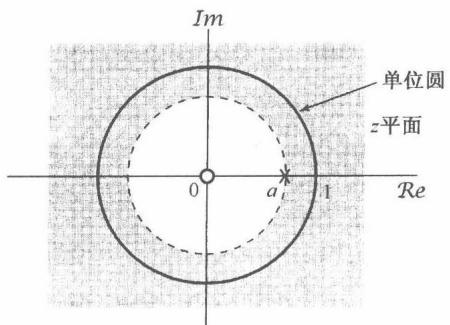 可以看到,式(10.9)的 变换是一个有理函数。当然,和拉普拉斯变换一样, 变换也能够用它的零点(分子多项式的根)和极点(分母多项式的根)来表示。对于这个例子,有一个在 的零点和一个在 的极点,当 为0和1之间的某个值时,例10.1的零-极点图和收敛域如图10.2所示。若 ,则收敛域不包括单位圆;这一点与下述事实是一致的:当 时, 的傅里叶变换不收敛。
