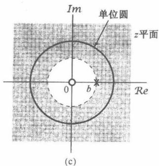 图10.12 与例10.8的 变换的表示式有关的三种可能收敛域。(a) 的零-极点图;(b) 是右边序列时的零-极点图和收敛域。在每种情况下,原点的零点都是二阶零点