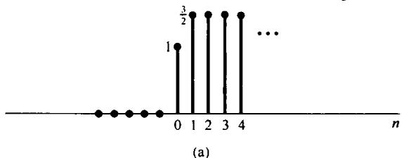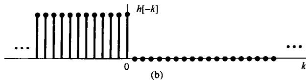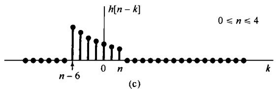 例2.2 重新考虑例2.1中的卷积问题。序列 示于图2.4(a);而序列 看成固定 时 的函数,对于几个不同的 值的序列示于图2.4(b)。在画这些序列时已经用到了这一点,就是 是单位脉冲响应 的时间反转与移位。随着 的增加,宗量 减小,这就说明了需要对 进行一个时间反转。知道了这一点,为了画出信号 ,仅仅需要确定对某个特定 值的 值就够了,例如,在 时,宗量 等于0。于是,如果画出了信号 ,只是将它右移 时),或左移 时),就得到了信号 。图2.4(b)画出了 和 时的结果。