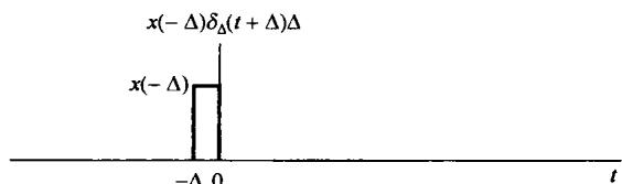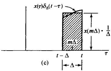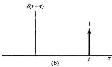 再次提出,式(2.27)应该看成在这种意义下的一种理想化结果。这就是从任何实际情况来看,对于“足够小”的 来说,式(2.25)中 的近似基本上就是准确的了。这样,式(2.27)就只是表示在 取为“难以觉察得到小”时式(2.25)的一种理想化结果。同时,也应该注意到,我们本来就能够利用1.4.2节讨论过的单位冲激函数的性质来直接导出式(2.27)。具体而言,如图2.14(b)所示,信号 是一个在 的时间轴上,发生在 固定)时的单位冲激函数。这样,信号 还是看成 的函数,就等于 (也就是一个发生在 ,面积等于 值的冲激),如图2.14(c)所示。那么,这个信号从 到 的积分就应等于 ,也就是