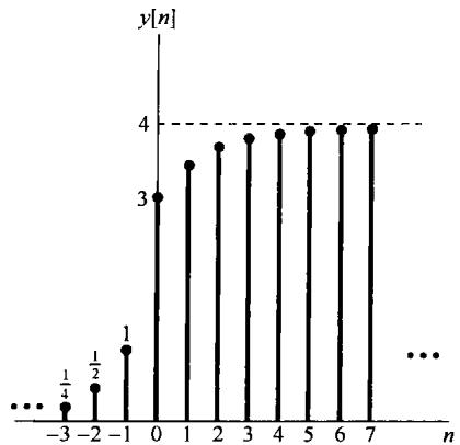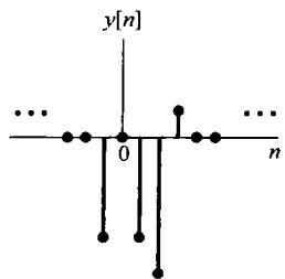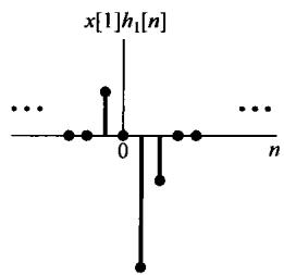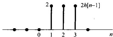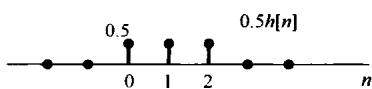 在求 时仅涉及两个单位脉冲响应的移位和加权的结果,即 和 两个序列,它们分别示于图2.3(b)。在每个 值上相加这两个序列就得到 ,如图2.3(c)所示。