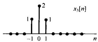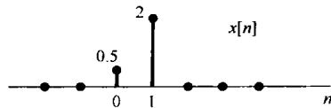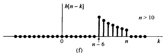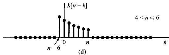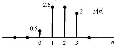 对于任何具体的 值,画出了 和 之后,将这两个信号相乘并在全部 值上相加。对该例来说,对于 ,由图2.4看出,因为 和 的非零值都不重合,所以 ,结果就是 时 。对于 ,因为序列 与序列 的乘积仅有一个非零样本,其值为0.5,所以有