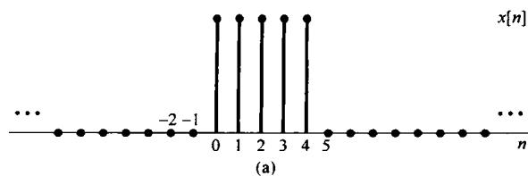 如何把任何离散时间信号看成由离散时间单位脉冲构成的关键是:要把一个离散时间信号当成一串单个脉冲来想象。为了明了如何把这种直观认识变成一种数学表示式,让我们来看图2.1(a)中的信号。在该图的其余部分画出了5个时间移位并加权了的单位脉冲序列,每个脉冲的大小与 所对应的时刻序列值相等,例如