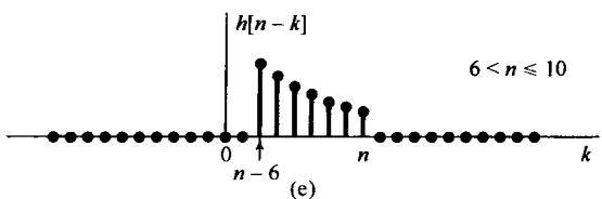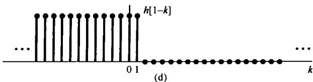 图2.4 对于图2.3中信号 和 ,式(2.6)的说明。(a)信号 ;(b)将 看成固定 时 的函数,对于几个 值 时的信号 ,这些信号都是由 的反转和移位来得出的。对每个 值的 是将图(a)中的 与图(b)中的 相乘,然后在全部 值上将乘积相加后得出的。这个例子的计算在例2.2中已详细做过