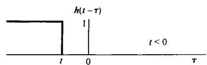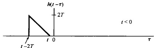 其中 。图2.5中画出了这两个信号。为了帮助我们想象并计算这两个信号的卷积,在图2.6中已经画出了 , , 和 (也就是 和 时的 ),以及最后对任意正 和负 值时的 。由这个图可知,对于 , 和 的非零部分没有任何重合,所以对于 而言, 对于所有的 值都为零,由式(2.6)可知 时 。对于