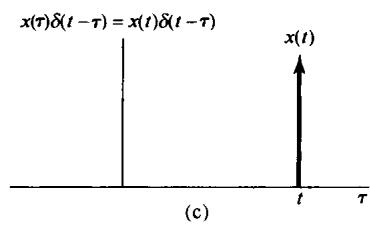 图2.14(a)任意信号 ;(b) 固定,作为 的函数的冲激 ;(c) 该二信号的乘积