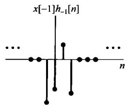 利用在每个单独输出样本上的叠加求和的结果,可以得出另一种有用的方法,即用卷积和来想象 的计算。现在具体考虑对某个特定的 值求 的问题。用图来展现这种计算的一种特别有用的方式是一开始就将信号 和 都看成 的函数,将它们相乘就得到序列 ,它可看成在每一个时刻 ,输入 对输出在时刻 做出的贡献,这样就能得出如下结论:将全部 序列中的样本值相加就是在所选定的时刻 的输出值。由此,为了