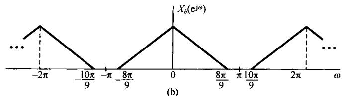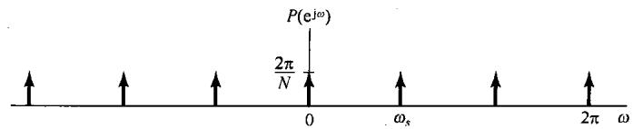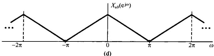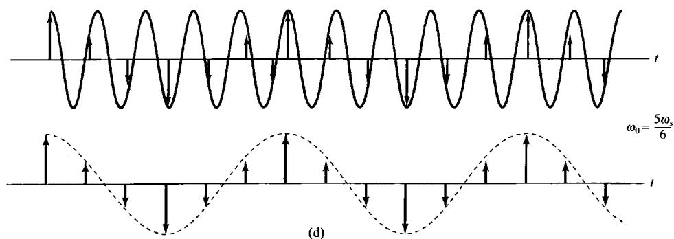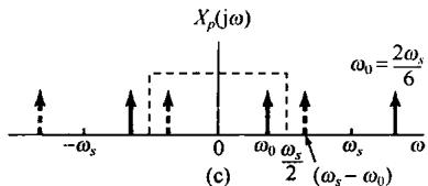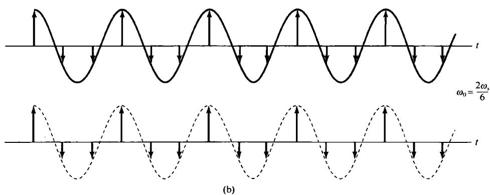 在这种情况下, 的傅里叶变换基本上与图7.15(a)是相同的,只是现在用实线标出的冲激有一个幅度因子 ,而用虚线标出的冲激,其幅度因子有一个相反的相位,即 。如果现在考虑用与图7.15所选的同一组 值,那么得到的 的已采样信号的频谱与该图也是一样的。只是所有的实线冲激都有 的幅度因子,而所有的虚线冲激都有 的幅度因子。再者,在图7.15(b)和图7.15(c)情况下,采样定理中的条件满足,所以 ;而在图7.15(d)和图7.15(e)情况下,再次发生混叠。然而,现在可以看到,出现在低通滤波器通带内的实线冲激和虚线冲激在位置上发生了颠倒,结果发现在这些情况下, ,这里在相位中的符号上有一个改变,即有一个相位倒置(phase reversal)。