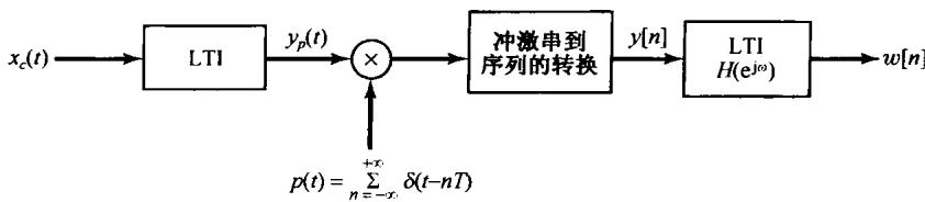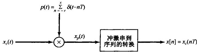 为了进一步明了连续时间信号 和它的离散时间表示 之间的关系,可以把从连续时间到离散时间的变换表示成一个周期采样的过程,再紧跟着一个把冲激串映射为一个序列的环节,这样做是非常有益的。这两步都表示在图7.21中。图中的第一步代表一个采样过程,冲