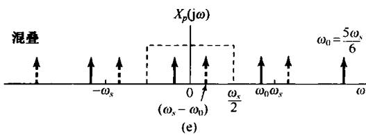 这个信号的傅里叶变换 如图7.15(a)所示。图中,为了讨论的方便,画图时已经把在 处的冲激与在 处的冲激进行了区别。现在来讨论 ,即已采样信号的频谱。在讨论中特别把注意力放在:对一个固定的采样频率 来说,当改变 后对 所产生的影响。在图7.15(b)至图7.15(e)中,画出了几个 值时的 。同时用虚线框起来的是图7.4中 的低通滤波器的通带。可以看到,在图7.15(b)和图7.15(c)中,由于 ,因此没有混叠现象发生,而在图7.15(d)和图7.15(e)中,混叠现象就出现了。在这4种情况下,经过低通滤波后的输出 分别是: