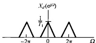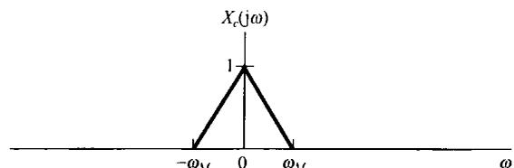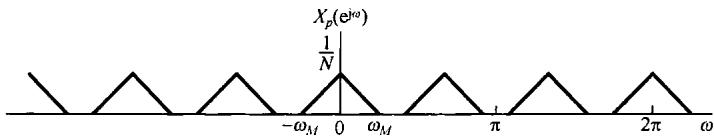 在频域来考察图7.19的处理过程也是很有启发意义的。由于我们面临着既要在连续时间又要在离散时间处理傅里叶变换,因此仅在这一节将连续时间的频率变量用 表示,将离散时间的频率变量用 表示,以便加以区分。例如, 和 的连续时间傅里叶变换分别用 和 表示;而 和 的离散时间傅里叶变换分别用 和 表示。