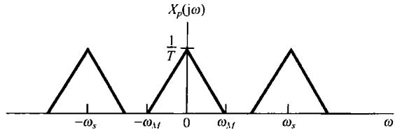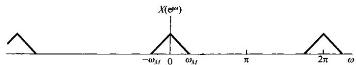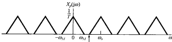 在前面的讨论中都假定采样频率足够高,因而满足采样定理中的条件。正如在图7.3中所说明的,当 时,采样信号的频谱是由 的频谱重复组成的,而这正是采样定理的基础。当 时, 的频谱 不再在 中重复,因此利用低通滤波也不再能把 从采样信号中恢复出来。这时,式(7.6)中的那些单项发生重叠,这一现象称为混叠(aliasing)。本节将讨论它的影响和一些结果。