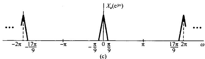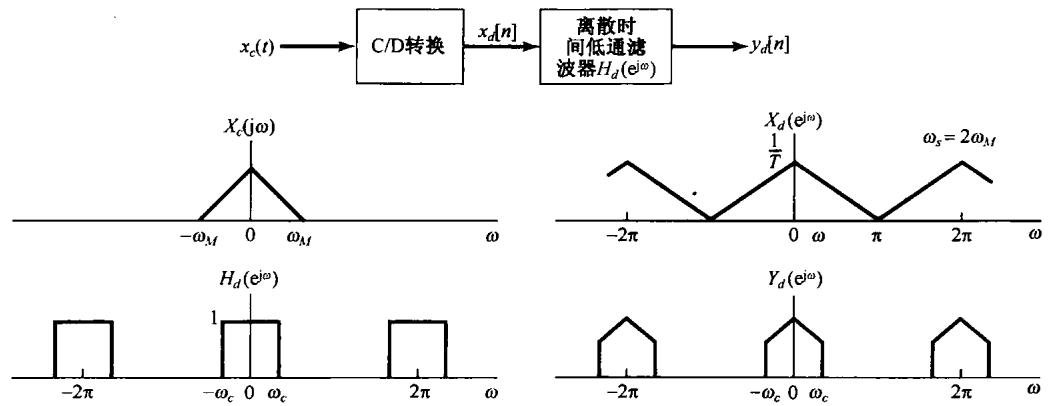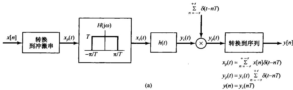 激串 就是一个冲激序列,各冲激的幅度与 的样本值相对应,而在时间间隔上等于采样周期 。然后,在从冲激串到离散时间序列的转换中,得到 ;这就是以 的样本值为序列值的同一序列,但是其单位间隔采用新的自变量 。因此,实际上从样本的冲激串到样本的离散时间序列的转换可认为是一个时间的归一化过程。图7.21(b)和图7.21(c)明确地表示了由 到 的转换中这种时间的归一化过程。在这里, 和 分别以 和 的两种采样率表示。