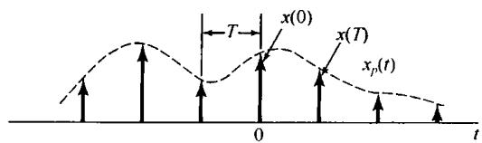由1.4.2节曾讨论过的单位冲激函数的采样性质可知, 被一个单位冲激函数相乘以后就将冲激发生的这一点的信号值采出来,即 。将此应用于式(7.1),如图7.2所示,可见 本身就是一个冲激串,其冲激的幅度等于 在以 为间隔处的样本值,即