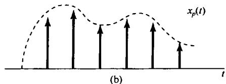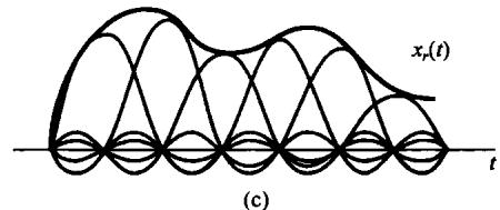 图7.10 利用sinc函数的理想带限内插。(a)带限信号 ;(b) 的样本冲激串;(c)用式(7.11)的sinc函数的叠加取代冲激串的理想带限内插