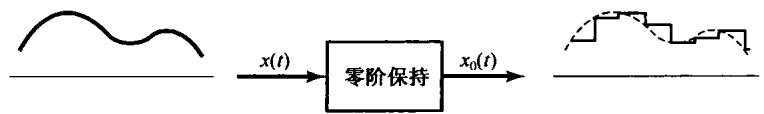 最容易利用冲激串采样来说明的采样定理确立了这样一个事实,即一个带限信号唯一地可以用它的样本来代表。实际上,产生和传输窄而幅度大的脉冲(这就很近似于冲激)都是相当困难的,因此以所谓零阶保持(zero-order hold)的方式来产生采样信号往往更方便些。在这样的系统中,在一个给定的瞬时对 采样并保持这一样本值,直到下一个样本被采到为止,如图7.5
