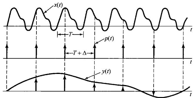 图P7.38(a)就是用来对快速变化的波形 进行采样,采样时每个周期采一次,但在相邻的下一个周期内,采样依次推迟。增量 应该是根据 的带宽而适当选择的一个采样间隔。如果让所得到的冲激串通过一个合适的低通内插滤波器,那么输出 将正比于减慢了的,或者在时间上被展宽了的原始快变化波形,即 正比于 ,其中 。