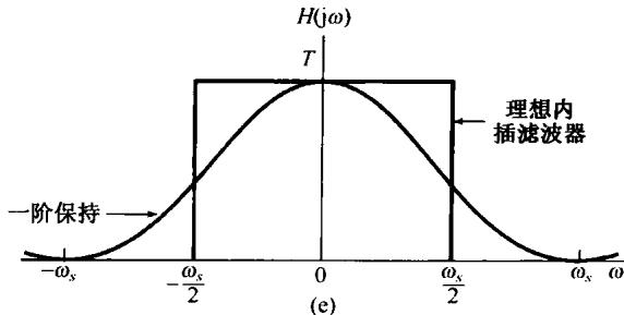 图7.13 把线性内插(一阶保持)看成冲激串采样与三角形冲激响应特性卷积的结果。(a)采样与恢复系统;(b)冲激串采样;(c)一阶保持的单位冲激响应;(d)对已采样信号施加一阶保持;(e)理想内插和一阶保持传输函数的比较