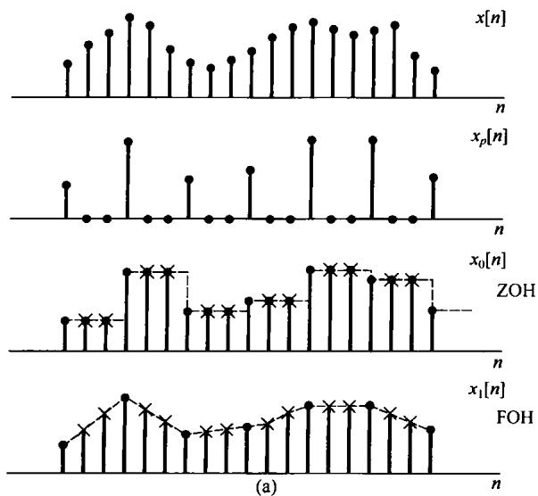 零阶保持代表一种近似内插,借此每个样本被重复(或保持) 次,图P7.50(a)给出 的情况。一阶保持则代表样本之间的线性内插,也如图P7.50(a)所示。