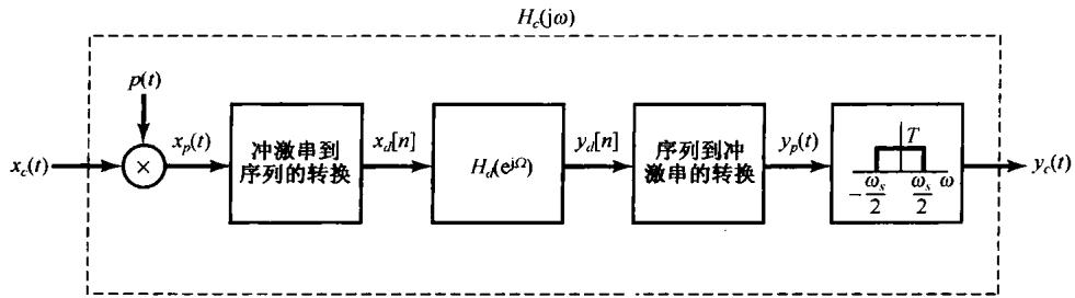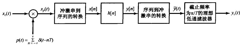 广而言之,对连续时间信号的这种处理方法可以看成图7.19所示的三个环节的级联,其中 和 都是连续时间信号,而 和 都是对应于 和 的离散时间信号。当然,就图7.19的整个系统而言,仍是一个连续时间系统,因为系统的输入和输出都是连续时间信号。将一个连续时间信号转换为一个离散时间信号,以及从信号的离散时间表示重建连续时间信号所依据的理论基础,都是7.1节讨论的采样定理。通过这样一个周期采样的过程(其采样频率满足采样定理中的条件),连续时间信号 就可以完全用一串瞬时样本值 来表示;也就是说,离散时间序列 以下式