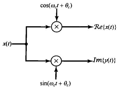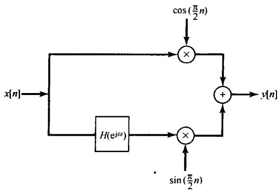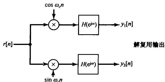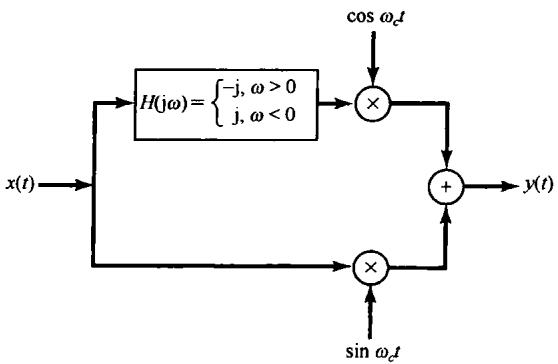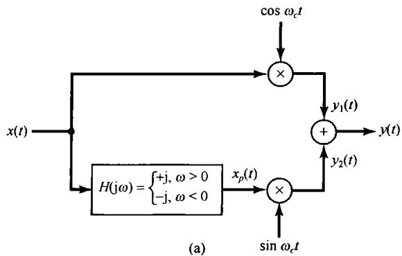 在 为实信号时,可以用图8.2来实现式(8.7)或式(8.8),这里要用两个单独的乘法器和两个相位相差 的正弦载波信号。在8.4节将给出一个应用的例子来说明使用图8.2所示的系统(用两个相位差 的正弦载波)将具有一些特别的好处。
