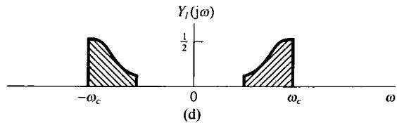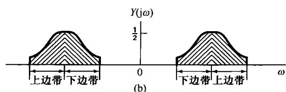 图8.19(a)示出了 的频谱,这里用不同的阴影线标出正负频率分量。图8.19(b)是用正弦载波调制得到的频谱,图中特别用上边带和下边带标出在 和 两边的频谱部分。比较图8.19(a)和图8.19(b)可以看出,如果仅保留正、负频率的上边带部分,那么 就可以恢复出来;或者类似地仅保留正、负频率的下边带部分,也可以将 恢复出来。仅保留上边带所得到的频谱如图8.19(c)所示,而图8.19(d)则是仅保留下边带时的频谱。将 转换到相应于图8.19(c)或图8.19(d)所示的形式称为单边带调制。与图8.19(b)相比,上、下两个边带都保留的称为双边带调制(double-sideband modulation,DSB)。