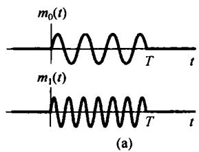 8.39 设想希望传送两个可能的消息中的一个,即消息 或消息 。为此,在长度为 的时间间隔内,发送两种频率之一的高频脉冲。注意, 与传送哪一个消息是无关的。对消息 将送出 ,而对消息 则送出 。于是,脉冲 看上去如图 P8.39(a) 所示。这种通信系统称为频移键控(FSK)。当高频脉冲 被收到时,就要判断它是代表消息 还是消息 。为此,按图 P8.39(b) 的方案去实现。