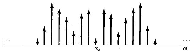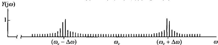 图8.14 同步与非同步正弦幅度调制系统频谱的比较。(a)调制信号的谱;(b)在同步系统中代表已调信号 的谱;(c)在非同步系统中代表已调信号 的谱