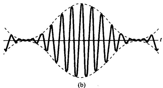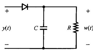 在很多应用正弦幅度调制的系统中,还有另一种称为非同步解调(asynchronous demodulation)的方法也经常被采用。非同步解调避免了在调制器和解调器间需要同步的困难。特别是,假设 总是正的,而载波频率 比调制信号的最高频率 高得多,在这种情况下已调信号 就会有图8.10所示的一般形式。特别是连接 中峰值的一条平滑曲线,称为 的包络线(envelope),将表现为 的一个合理的近似。于是, 就能够近似地通过一个系统而得到恢复,该系统可以跟踪着 的峰值,通过提取这一包络即可将 恢复出来。这样的系统称为包络检波器(envelope detector)。图8.11(a)是用来作为包络检波器的一个简单电路的例子,这种电路一般都跟着一个低通滤波器以减小包络中载频的波动,这种波动在图8.11(b)中很明显,并且一般都会在图8.11(a)所示的包络检波器的输出端存在。