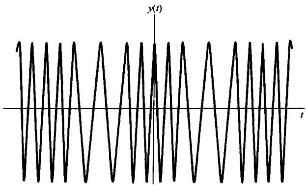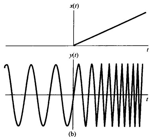 因为瞬时频率 也是时间的函数,所以信号 就可以当成一个频率调制信号。特别是,因为这个信号的瞬时频率是随时间线性地扫过频谱,因此通常就称它为线性调频信号,或称“鸟声”信号。