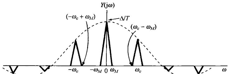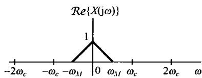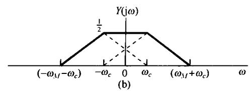 图8.3 正弦载波的幅度调制 若 如图8.4(a)所示,则 的频谱如图8.4(c)所示。从图中可以注意到,以 和 为中心都有一个原始信号频谱形状的重复。结果只要 ,就能从 中恢复出 ;否则,这两个重复的频谱将会有重叠。与复指数载波的情况相比,在那里原始信号频谱形状的重复仅在 附近出现,因此,正如在8.1.1节所看到的,在以复指数为载波的幅度调制中,对任意选取的 ,总是可以按式(8.7)采用乘以 ,将频谱移回到它原来位置的办法,将 从 中恢复出来。另一方面,用正弦载波,如果 ,由图8.4可见, 的两个重复的频谱之间将会有重叠。例如在图8.5中, 时的 就是那样。很明显,这时 的频谱不再在 中重复原样,因此也就不再可能从 中将 恢复出来。