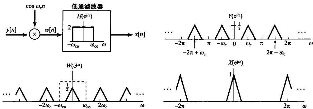 正如在例4.21中所做的那样,原始信号可以通过用 来调制同样一个正弦载波并用一个低通滤波器把它恢复出来。为了说明这一点,考虑如下过程: