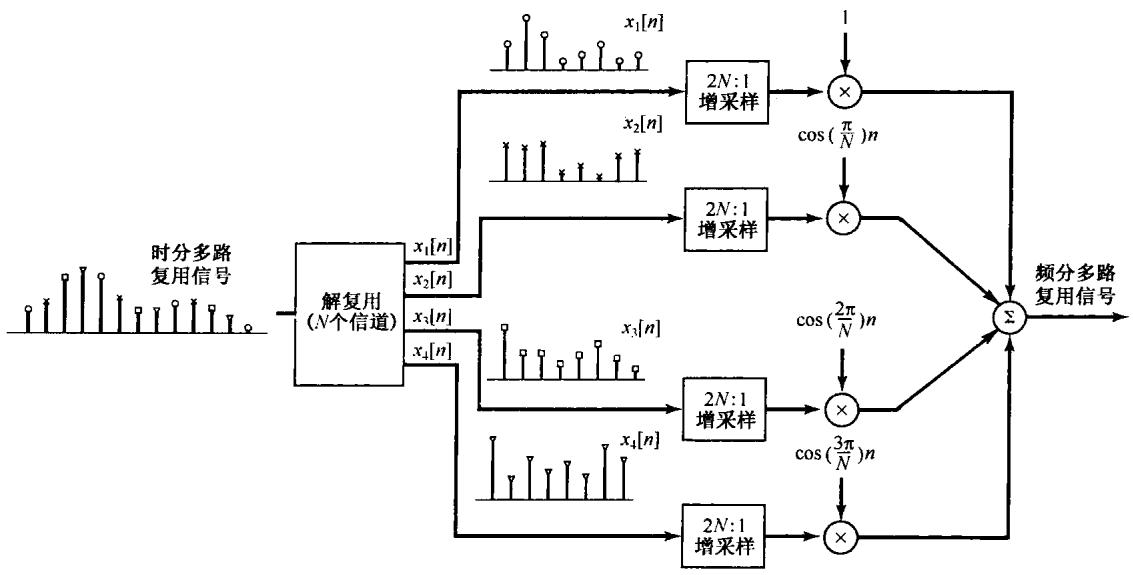 (a) 假设每一路信号 都经过适当增采样,然后与 调制。为确保频分多路复用的频谱不发生任何混叠,试问对 最小的增采样量是多少?