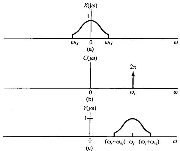 图8.1 复指数载波的幅度调制在频域上的效果。(a)调制信号 的频谱;(b)载波信号 的谱;(c)幅度已调信号 的谱