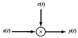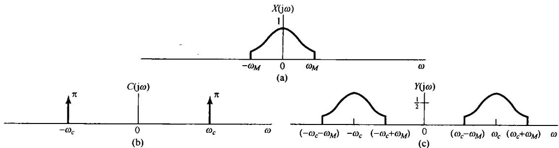 很多通信系统都建立在正弦幅度调制的基础上,在这里一个复指数信号或正弦信号 的振幅被载有信息的信号 相乘(或调制)。信号 一般称为调制信号(modulating signal),而信号 称为载波信号(carrier signal),已调信号 就是这两个信号的乘积,即