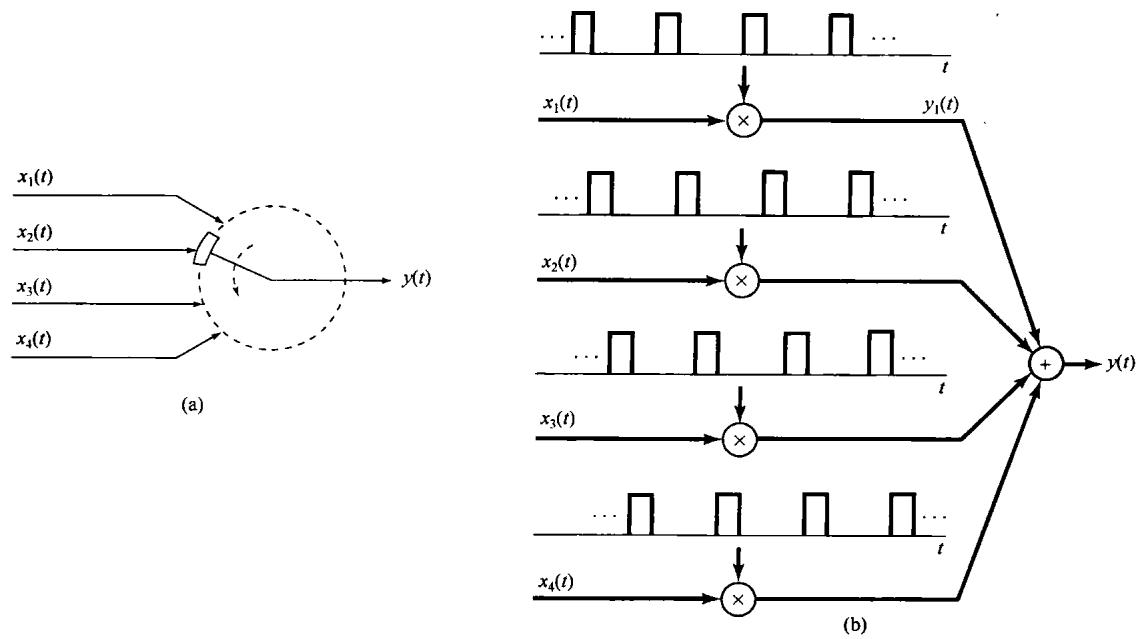8.40 在 8.3 节中曾讨论过利用正弦幅度调制实现频分多路复用,借以把几个信号搬移到不同的频带上,然后把它们加起来同时发送出去。本题将研究另一种称为正交多路复用(quadrature multiplexing)的概念。按此多路复用方法,如果两个载波信号的相位相差 ,那么这两个信号可以同时在同一频带内传送。该多路复用系统如图 P8.40(a) 所示,其解复用系统如图 P8.40(b) 所示。