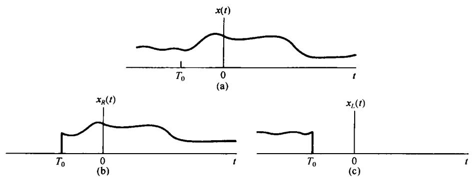 图9.9 双边信号分成右边信号和左边信号之和。(a) 双边信号 ; (b) 等于零, 而 等于 的右边信号; (c) 等于零, 而 等于 的左边信号