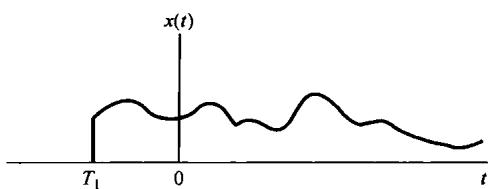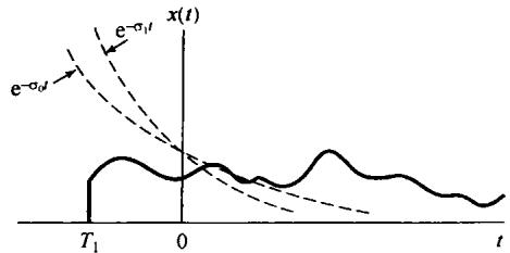 若在某有限时间 之前, ,则称该信号为右边(right-side)信号,如图9.6所示。对于这样一个信号,有可能不存在任何s值,使其拉普拉斯变换收敛。一个例子就是 。然而,假如拉普拉斯变换对某一 值收敛,比如 ,那么